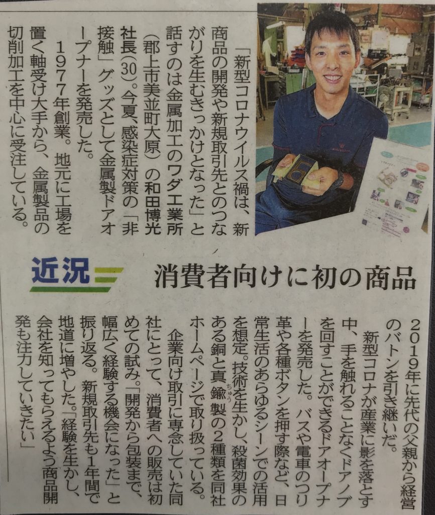 2020年10月13日に岐阜新聞様より、ワダ工業所の今後と展望に関してと、ドアオープナーに関して取材を受け